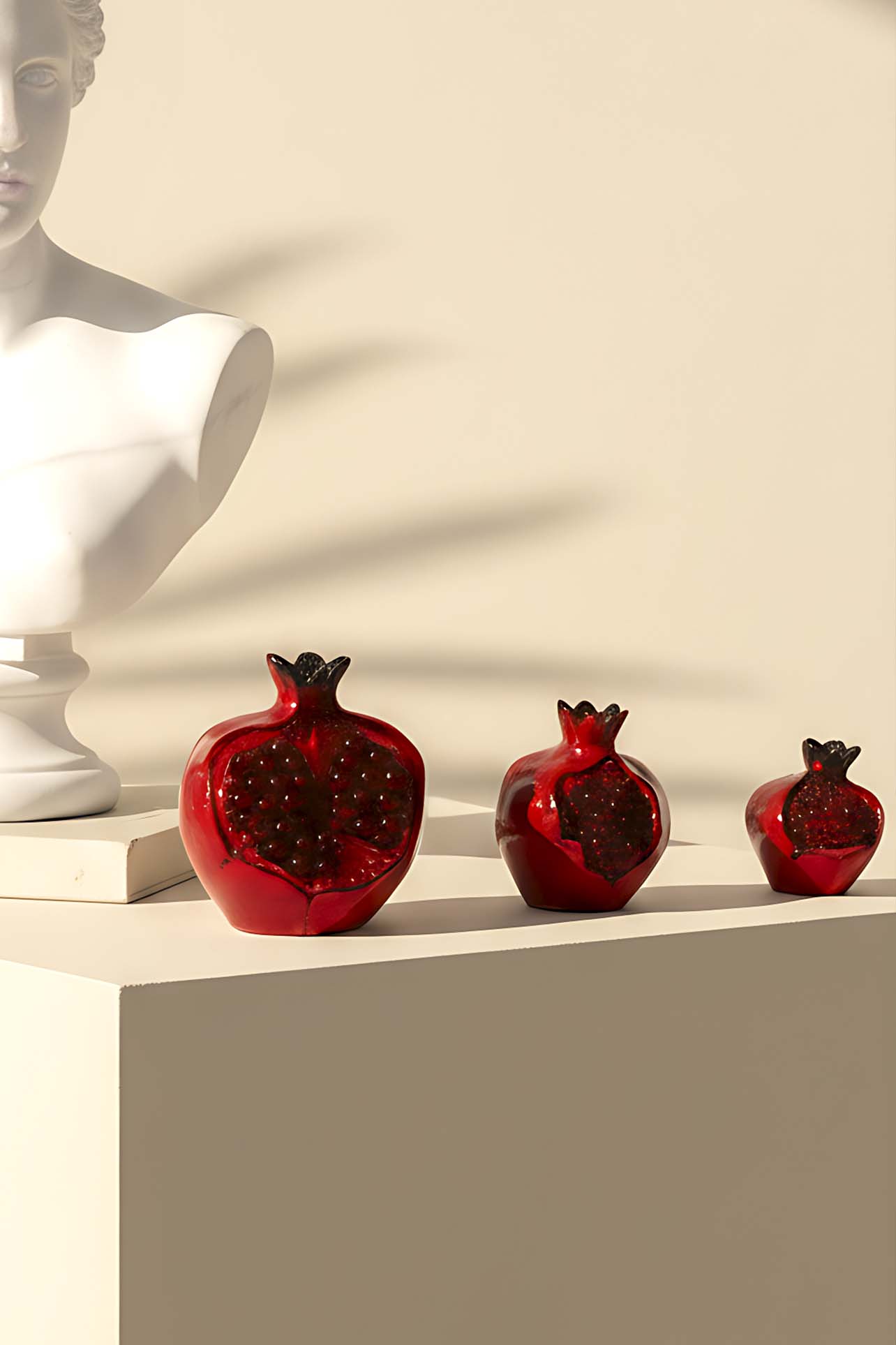 This decorative half pomegranate object stands out with its detailed interior design, offering a modern and unique appearance. With its glossy red surface and interior inspired by realistic pomegranate seeds, it creates an aesthetic focal point in any space.