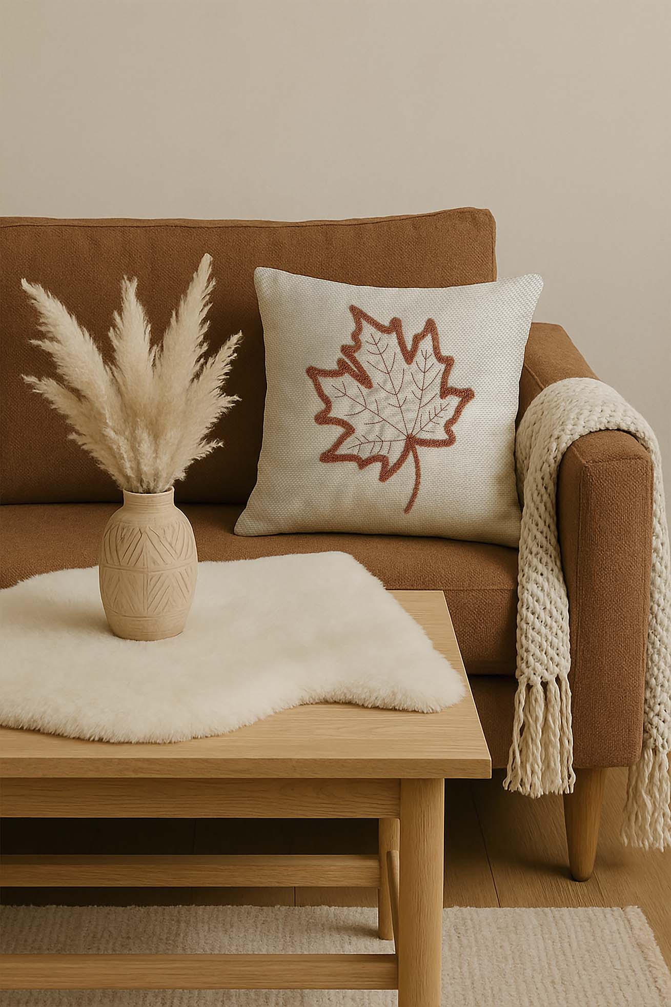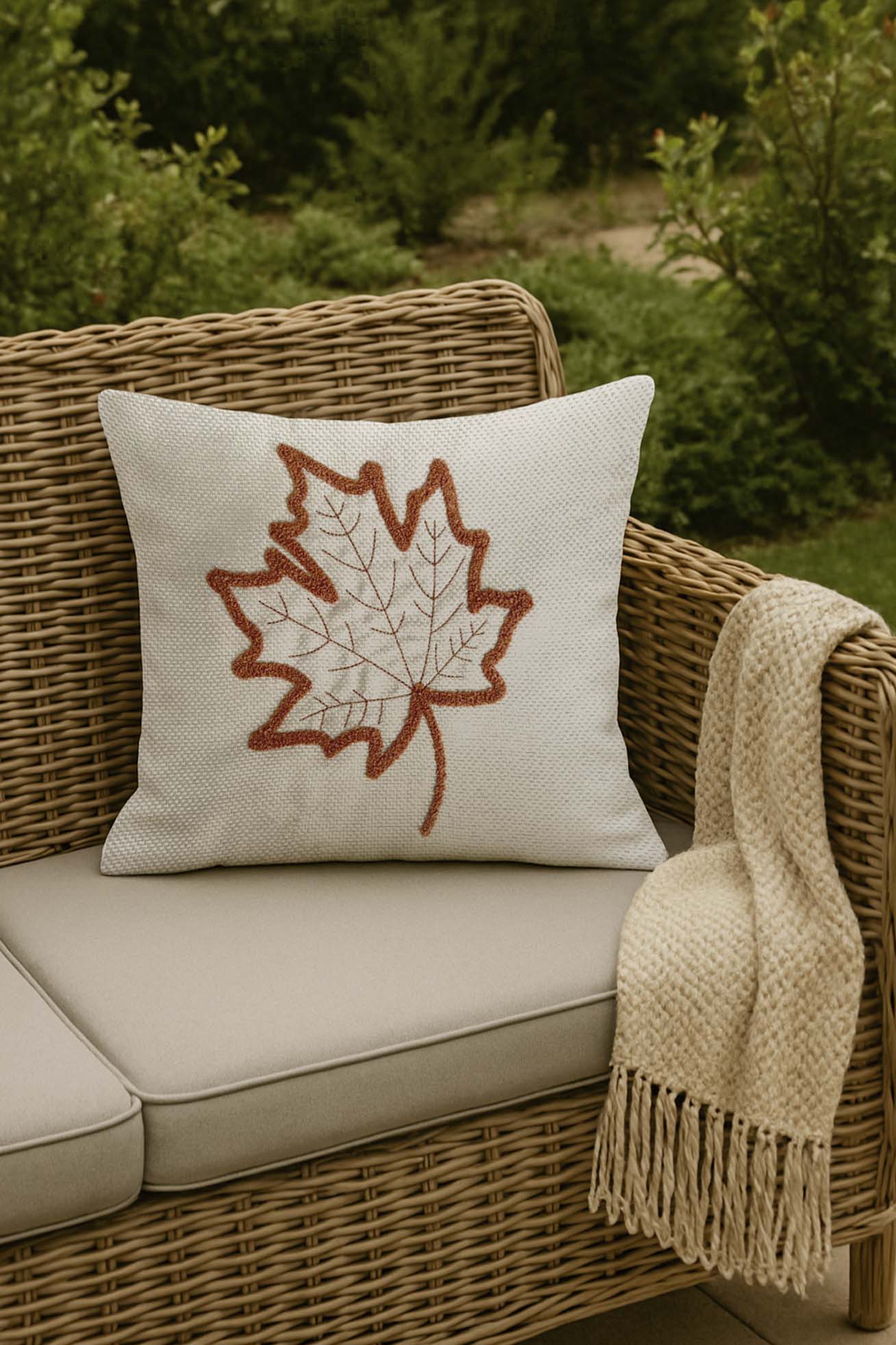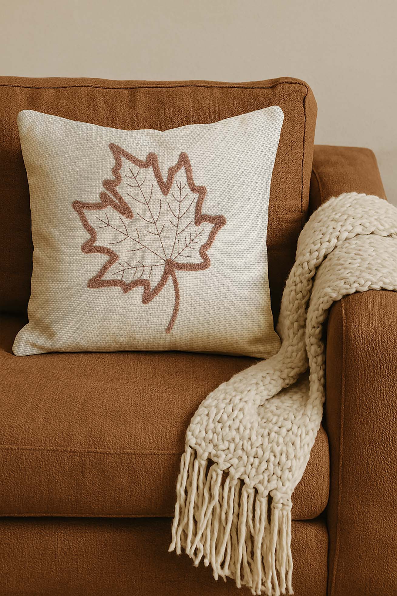 • Terracotta Leaf Patterned Woven Straw-Look Punch Cushion Cover