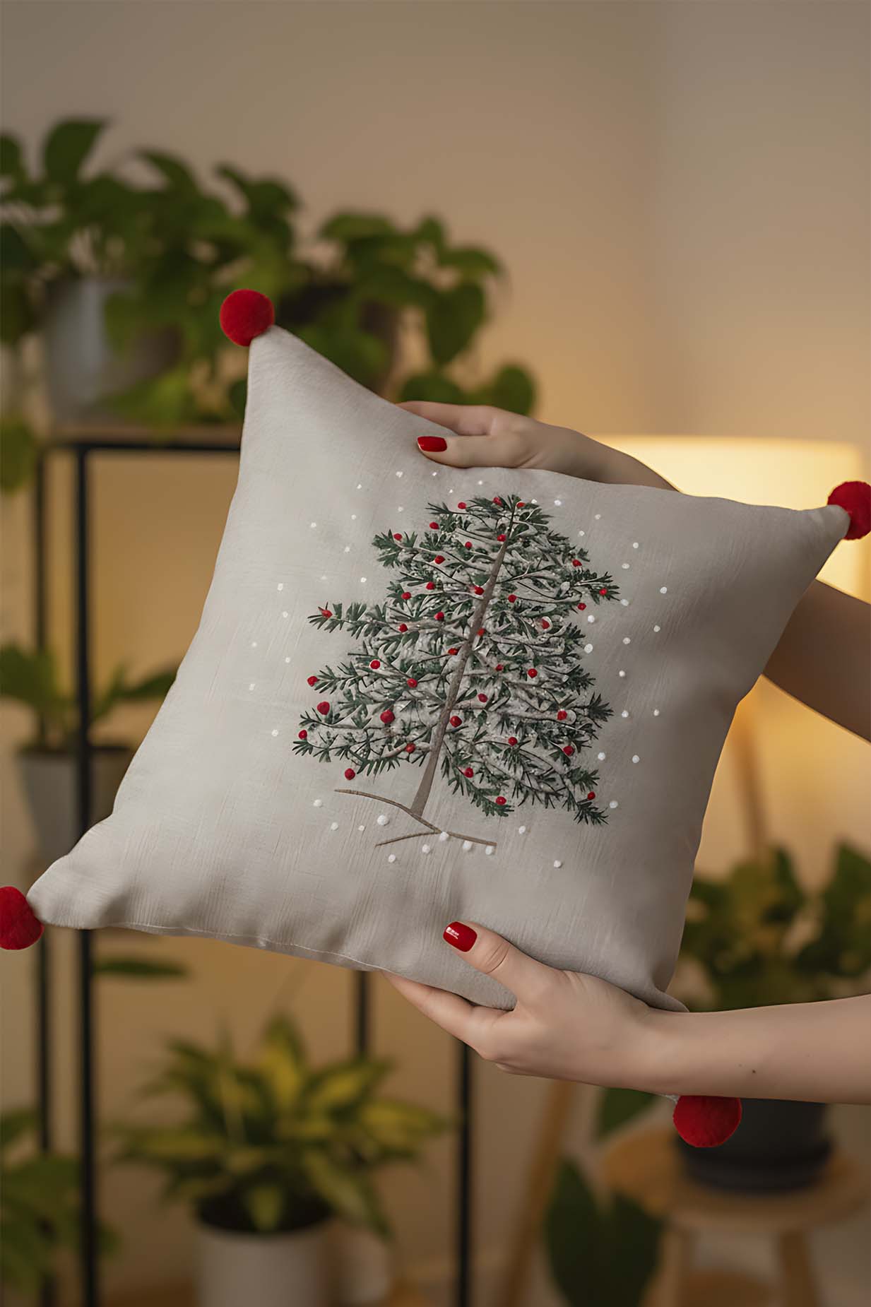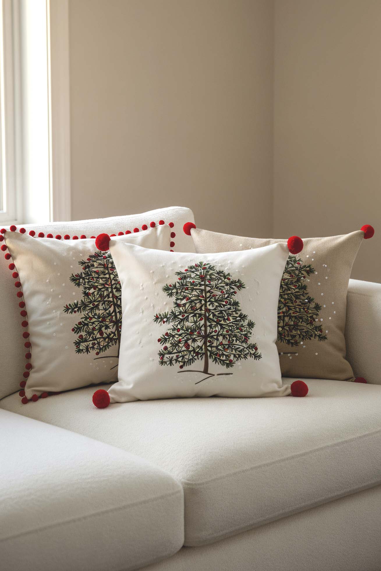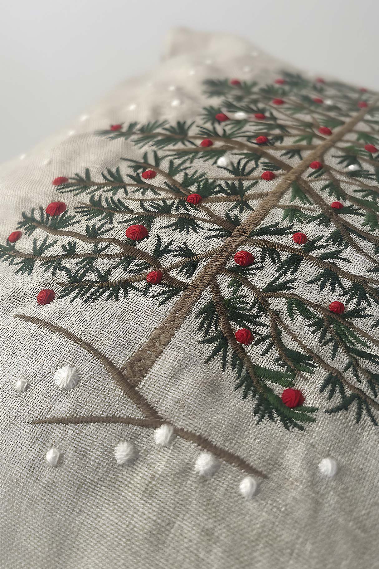 • Beige Pine Tree Embroidered Pom Pom Decorative Pillow Cover, 43x43 cm, Woven Wicker Look, Polyester, Hidden Zipper, Farmhouse Style Accent Pillow Cover