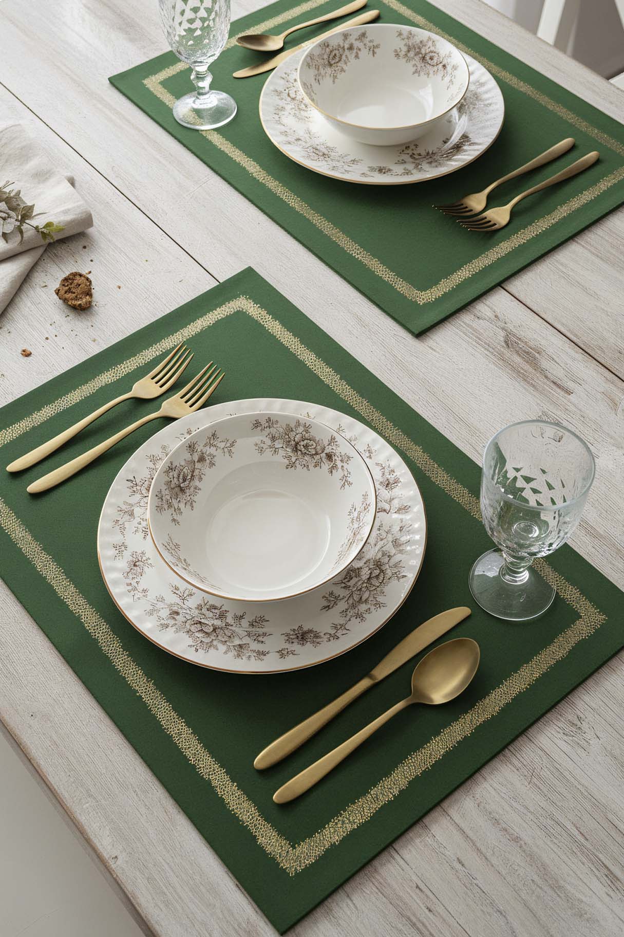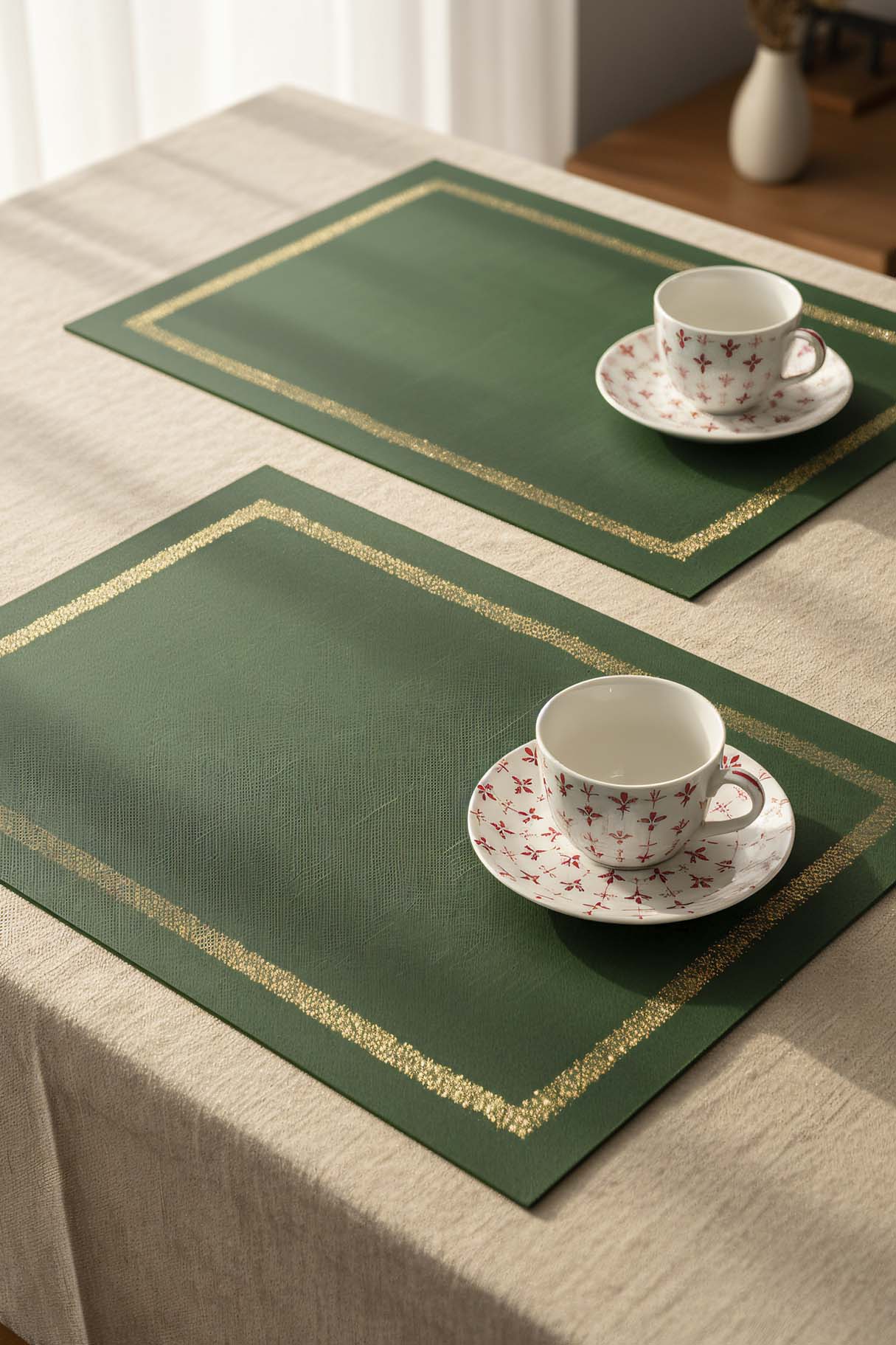 Green Gold Frame Embroidered 2-Piece Placemat Set This set, combining the color green with modern and durable polyester quality, brings both elegance and practicality to your table. Material: Made from 100% high-quality polyester. Design: Offers an aesthetic look with elegant gold frame embroidery. Dimensions: 30x50 cm provides an ideal usage area for all types of dinnerware. Durability: The color will not fade, it will not shrink, and it is suitable for long-term use. Package Contents: 2 placemats.