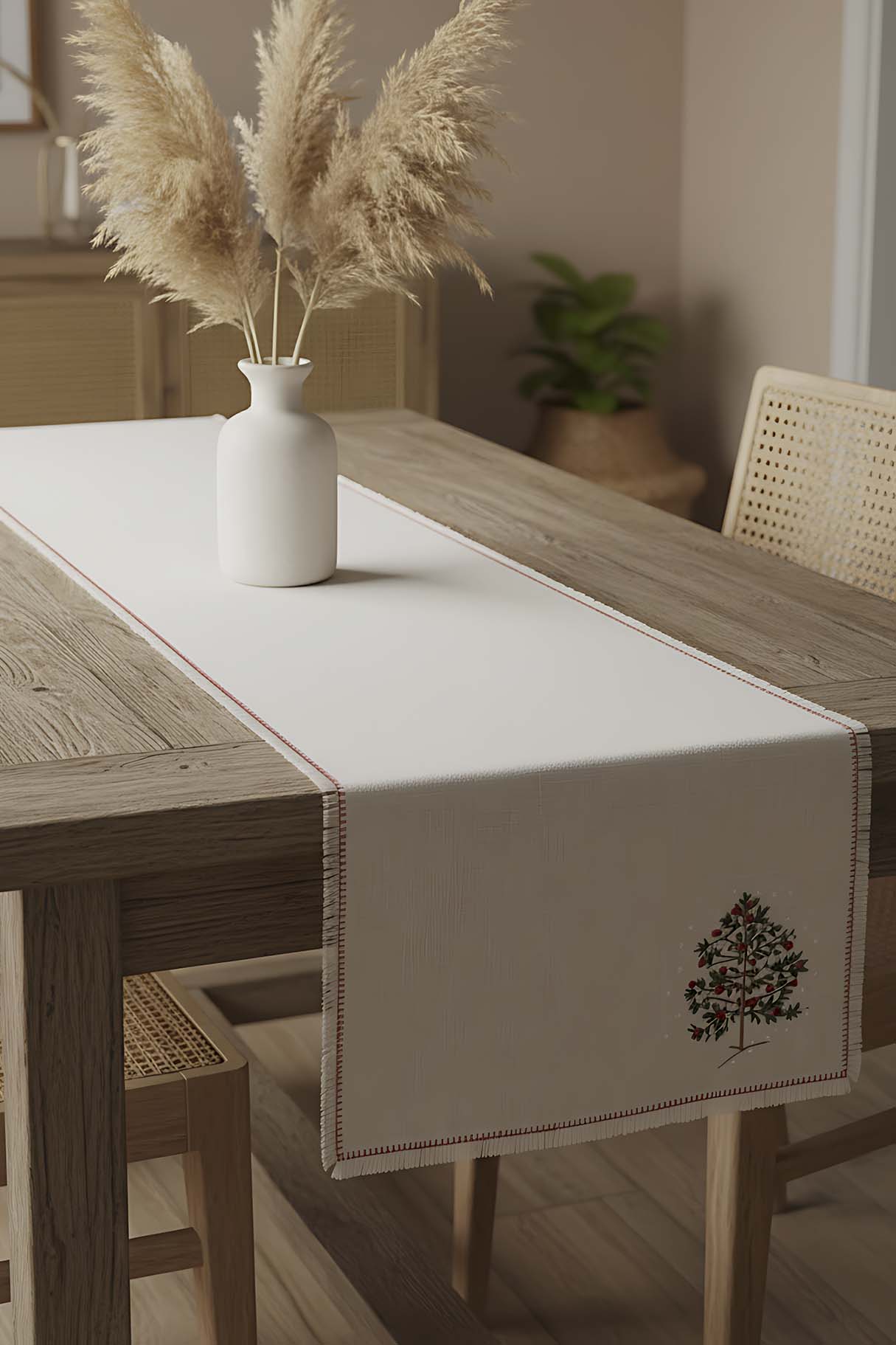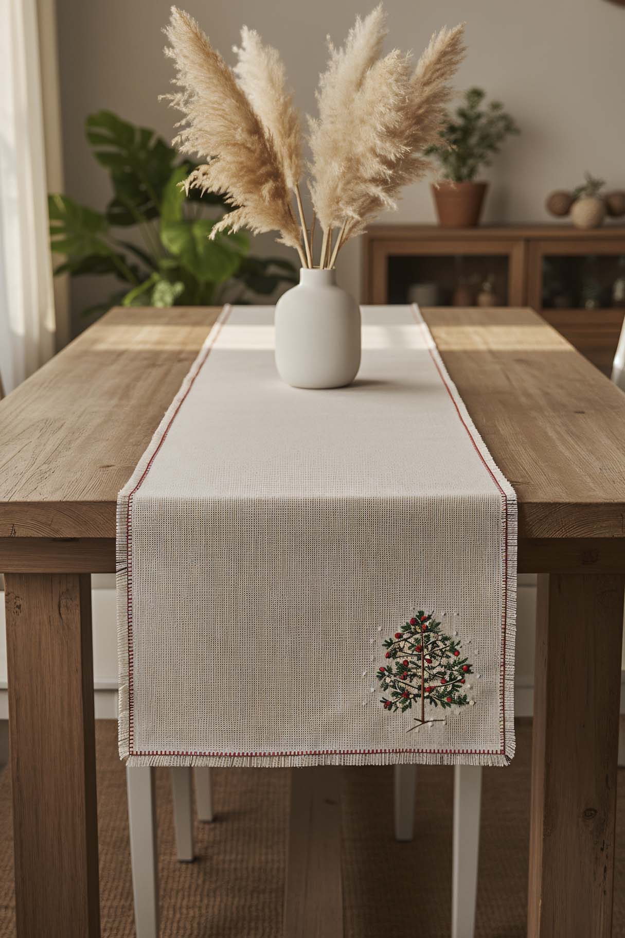 Product Description: With its natural wicker-look texture, elegant pine tree embroidery, and fringed edge details, this pine tree embroidered runner adds a warm and stylish atmosphere to your table. Measuring 40x115 cm, it offers a balanced look on the table and is an eye-catching piece that complements your decor both for daily use and for Christmas and winter-themed events. Product Features: Color: Beige (Ground) Size: 40x115 cm Usage Area: Dining Table, Dresser, Coffee Table and More Fabric: 100% Polyester.