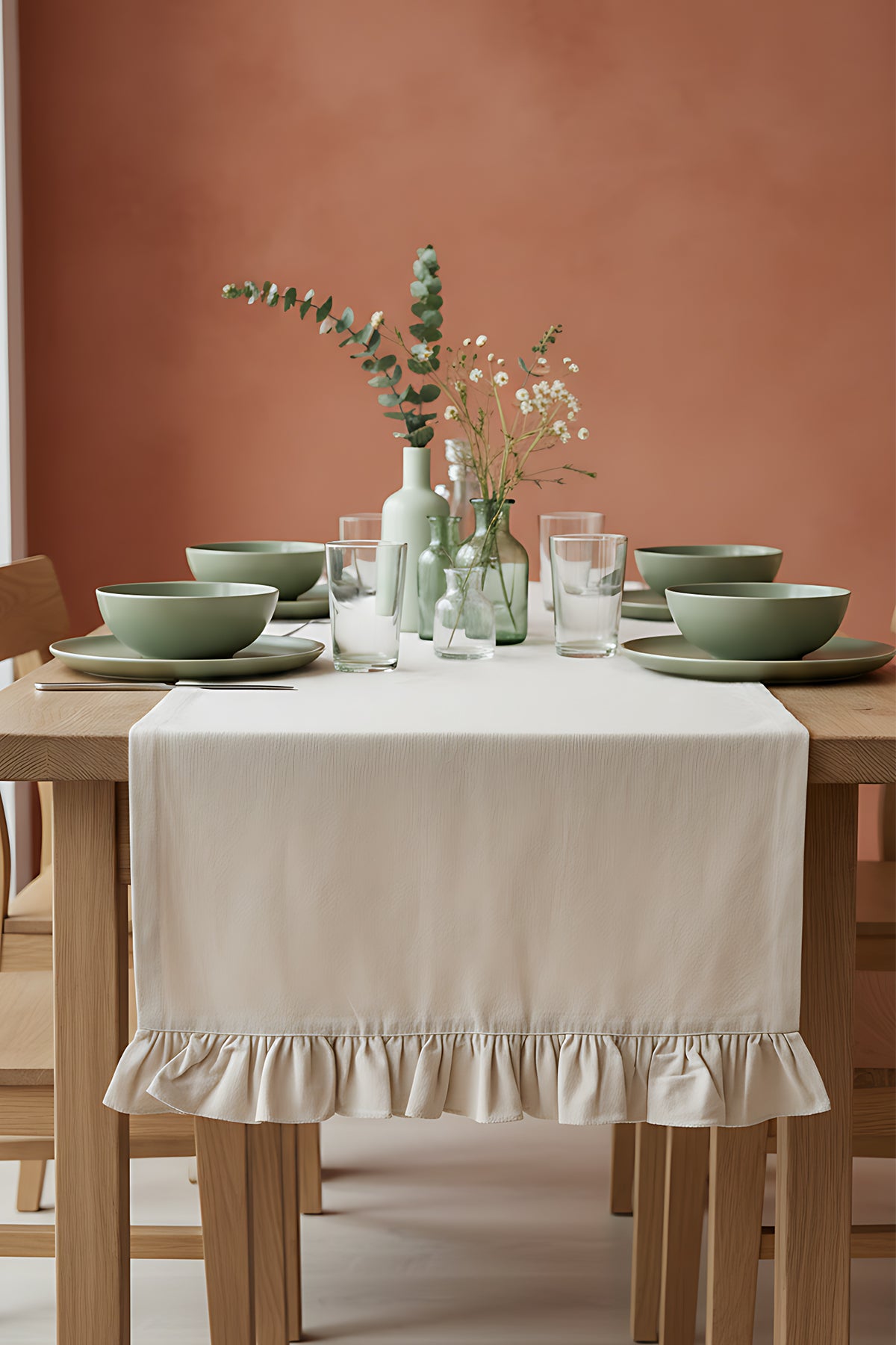 lending elegance with natural charm, the Ruffle Runner adds warmth and authenticity to your table with its 100% cotton raw linen texture. With its ruffled edge detail, this special piece creates a rustic and romantic atmosphere, making it suitable for both everyday use and special occasions.
