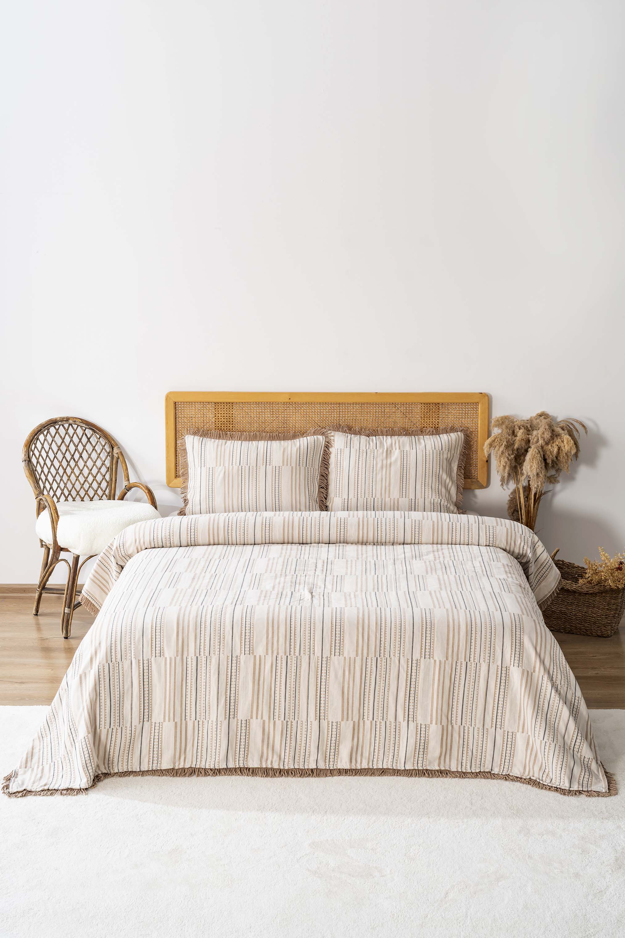 Lia Beige Double Bed Tasselled Bedspread Set consists of 3 pieces.